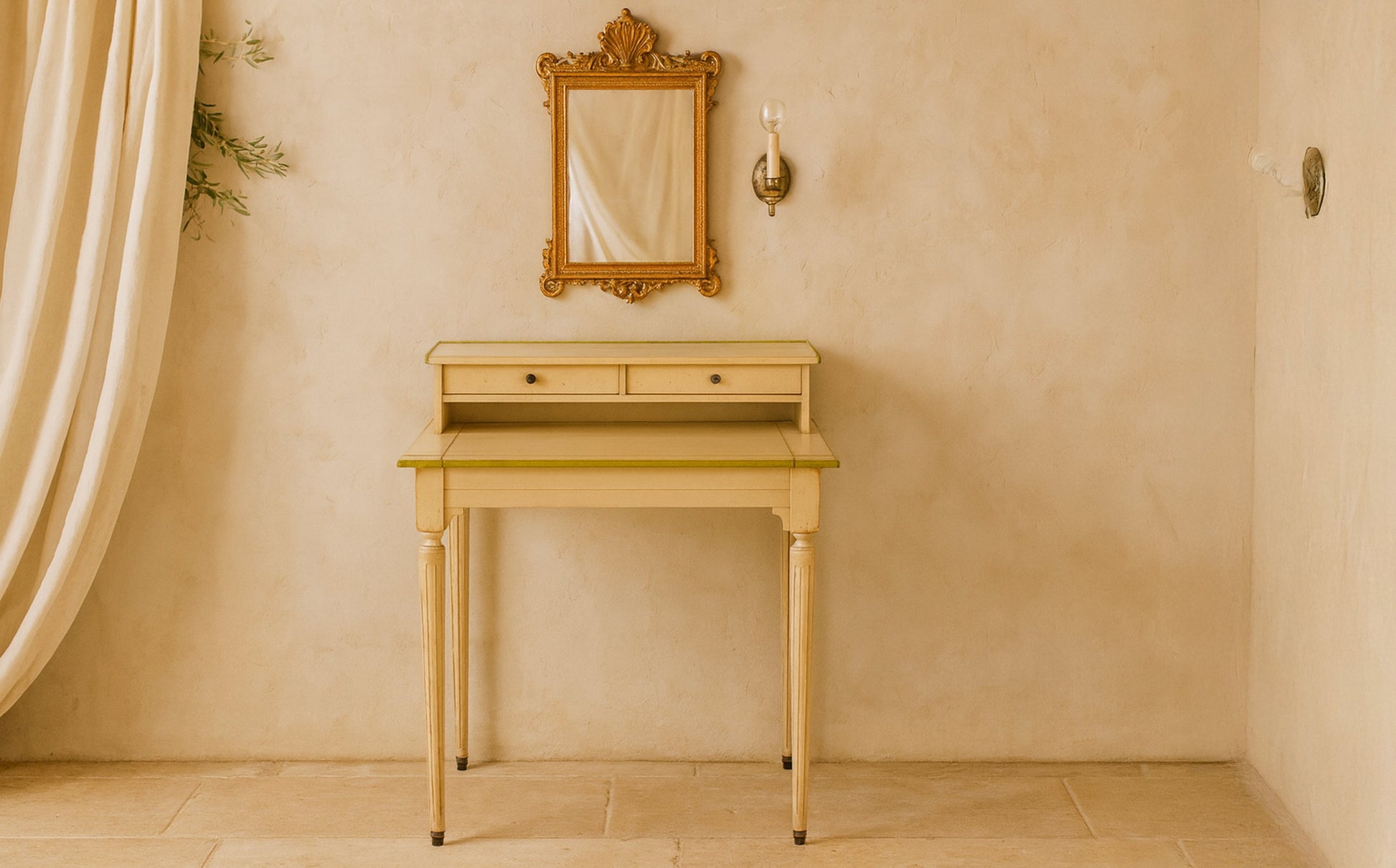 Der Schreibtisch auf dem Foto ist ein charmantes Vintage-Stück im eleganten französischen Stil. Seine sanfte cremefarbene Lackierung mit dezenten Gebrauchsspuren verleiht ihm einen authentischen und zeitlosen Charakter. Die Kanten sind mit einer feinen, olivgrünen Paspelierung verziert, die dem Schreibtisch eine verspielte und zugleich edle Note verleiht.