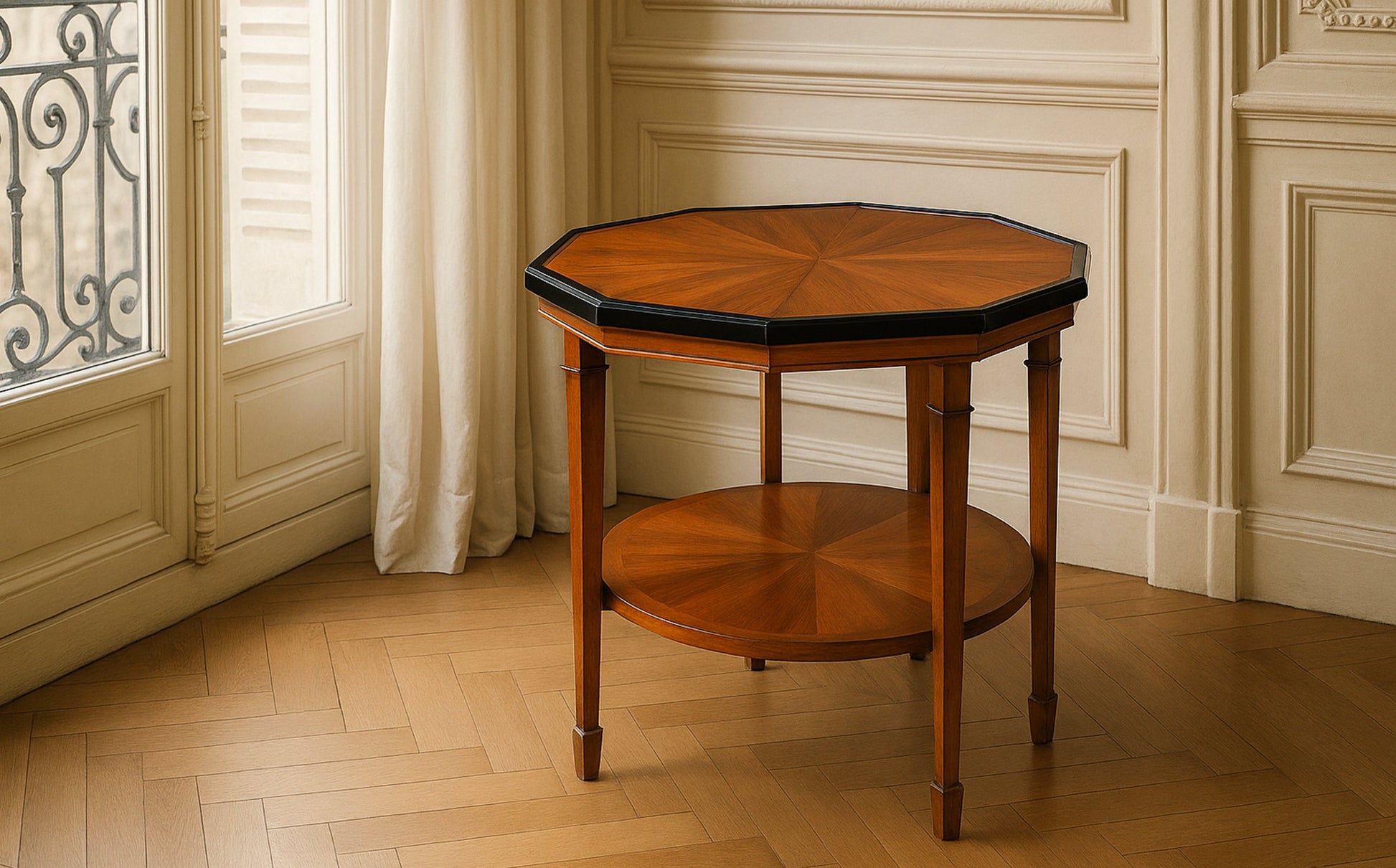 Placed in a classic Parisian interior with tall windows, ornate wall panels, and soft natural light, the rich woodwork truly shines. This table exudes timeless class and makes a stylish addition to a living room, sitting room, or elegant entryway.