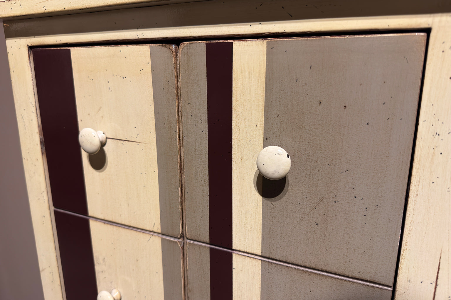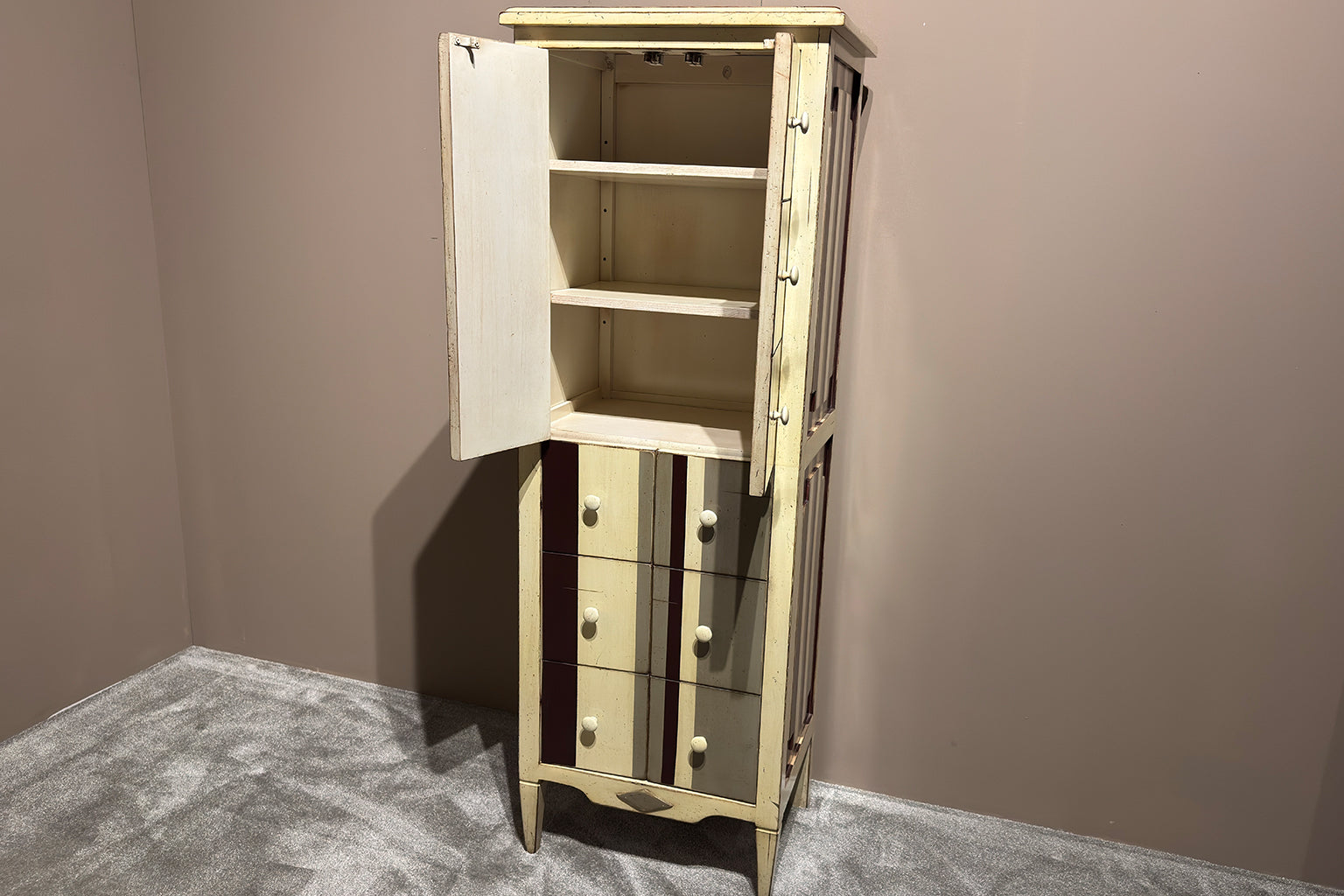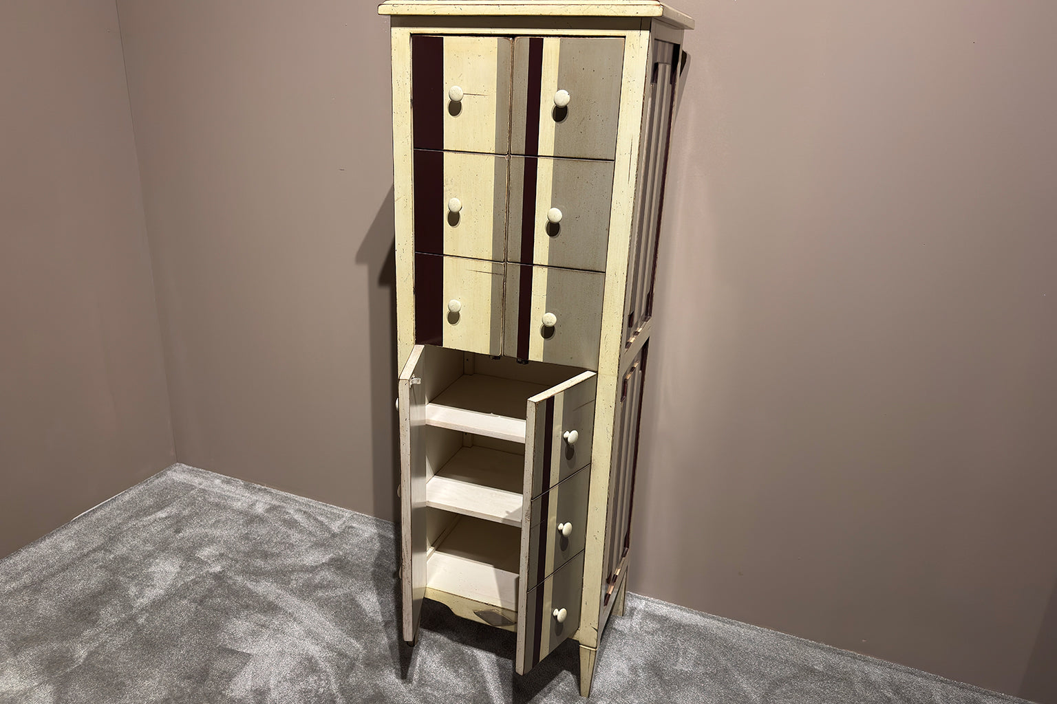 Een smal en hoog kastje. De voorkant oogt als een reeks kleine lades, maar achter de boven- en onderzijde gaan handige deurtjes schuil. Compact van formaat, maar opvallend in design – perfect voor in de hal of slaapkamer.