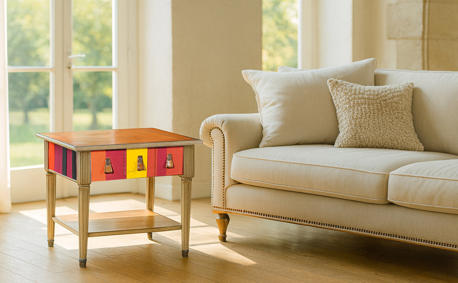 Ontdek de prachtige salontafel Jacob, een meesterwerk uit onze exclusieve New Grange collectie. Deze schitterende tafel straalt in een betoverend kleurrijk streeppatroon, waardoor hij een echte eyecatcher is in elk interieur.