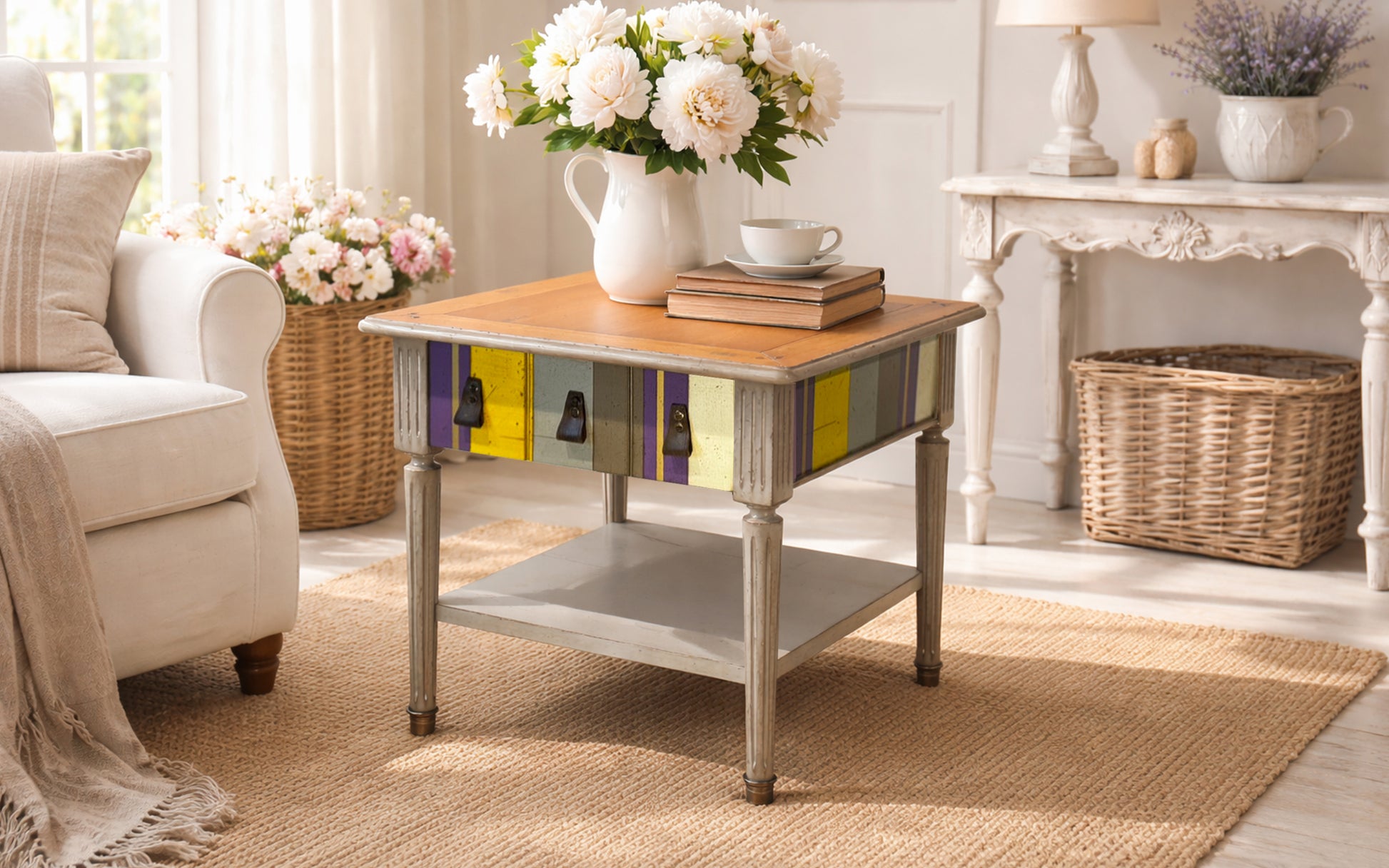 Ontdek de prachtige salontafel Jacob, een meesterwerk uit onze exclusieve New Grange collectie. Deze schitterende tafel straalt in een betoverend kleurrijk streeppatroon, waardoor hij een echte eyecatcher is in elk interieur.