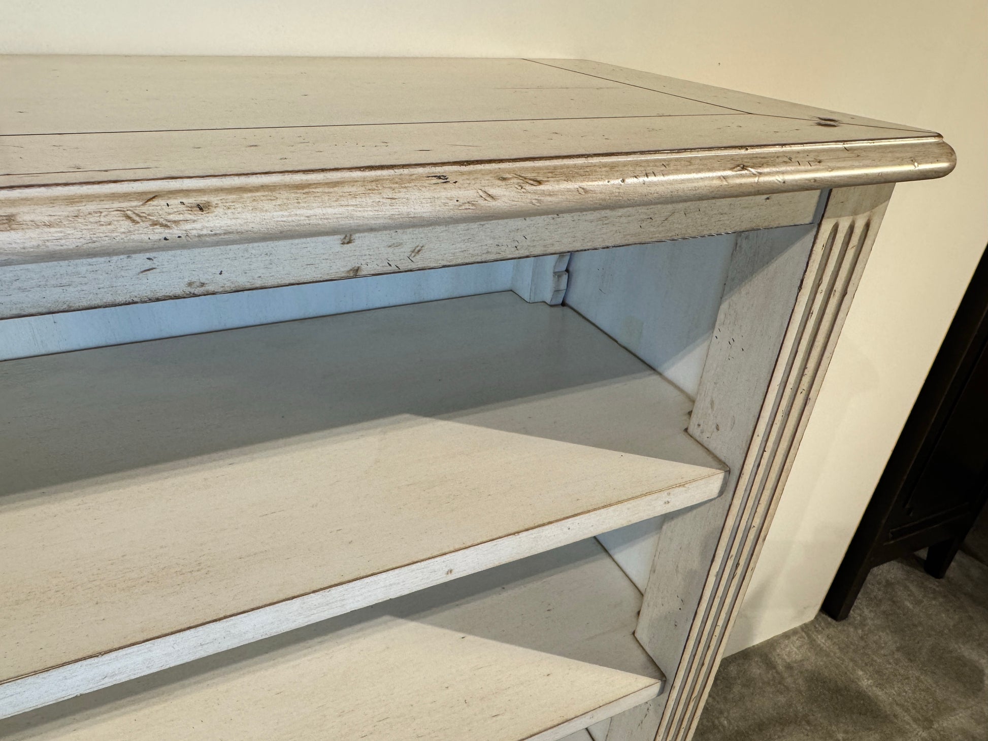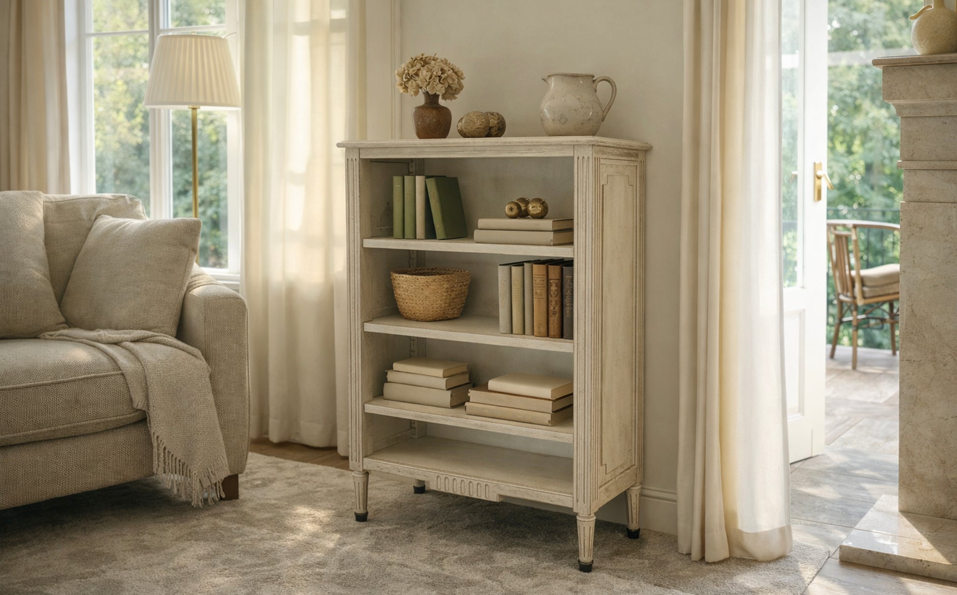 Het boekenkastje Jacob uit de New Grange collectie straalt rust en elegantie uit. Met zijn zachte, crème kleurige houttint, klassieke lijnen en verfijnde details past het perfect in een landelijk of tijdloos interieur. Ideaal voor het stijlvol opbergen en presenteren van boeken en decoratie.
