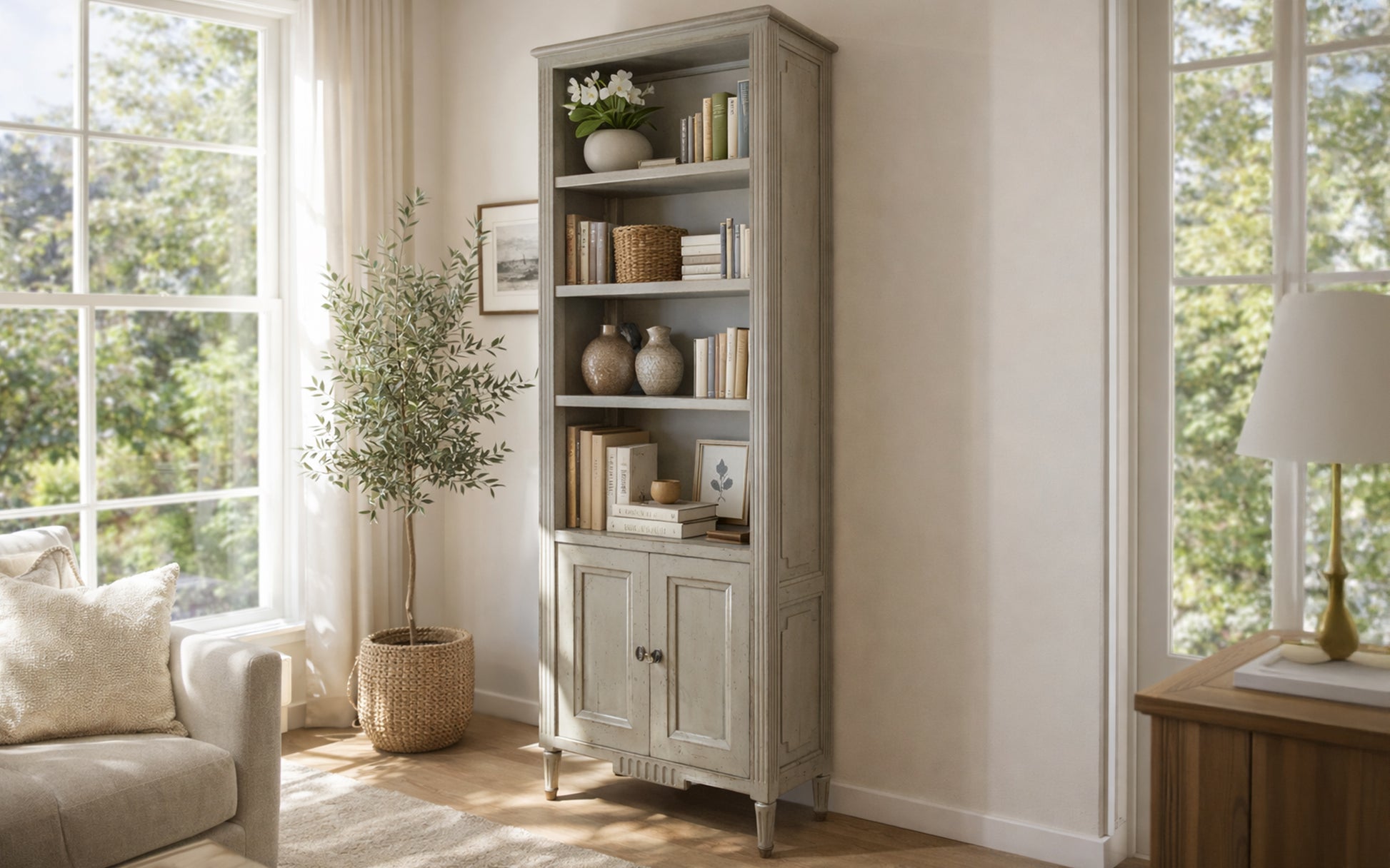 Het Smalle boekenkastje Jacob uit de New Grange collectie straalt rust en elegantie uit. Met zijn zachte, crème kleurige houttint, klassieke lijnen en verfijnde details past het perfect in een landelijk of tijdloos interieur. Ideaal voor het stijlvol opbergen en presenteren van boeken en decoratie.