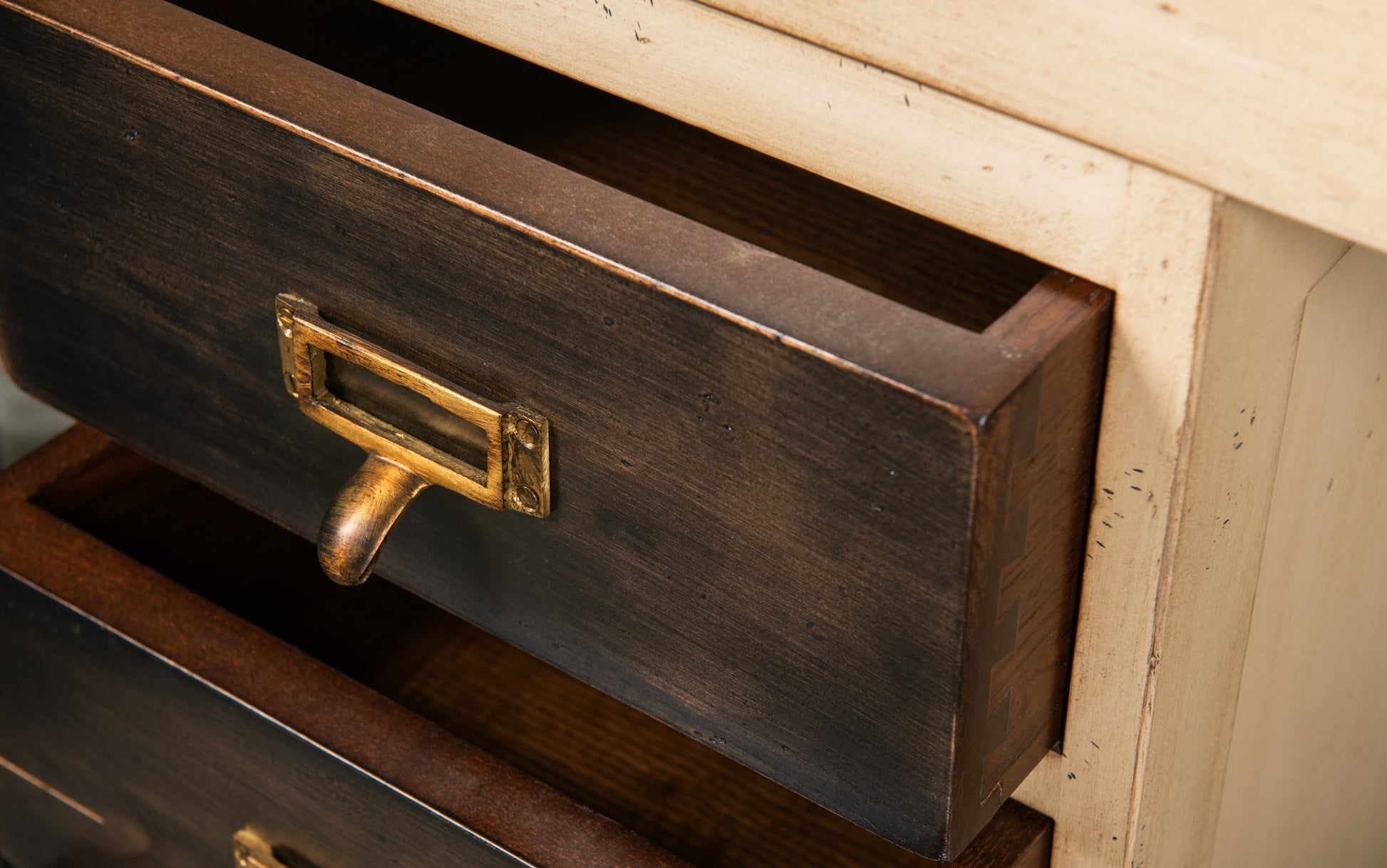 De handgepatineerde afwerking en het contrasterende houtwerk brengen warmte en karakter in elke ruimte.