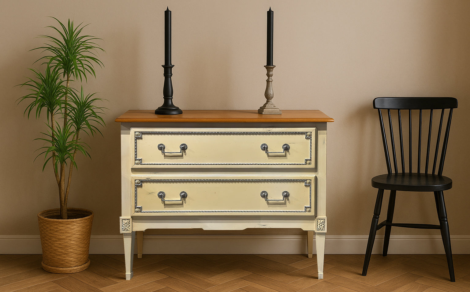 Prachtige commode met twee ruime lades, uitgevoerd in een zachte crème tint met sierlijke zilverkleurige details langs de randen en handgrepen. Het bovenblad is van warm hout, wat een mooi contrast vormt met de lichte kast. De poten zijn slank en subtiel gedecoreerd, wat bijdraagt aan de verfijnde uitstraling. Dit meubelstuk past perfect in zowel een klassiek als landelijk interieur en biedt praktische opbergruimte met een stijlvolle uitstraling.