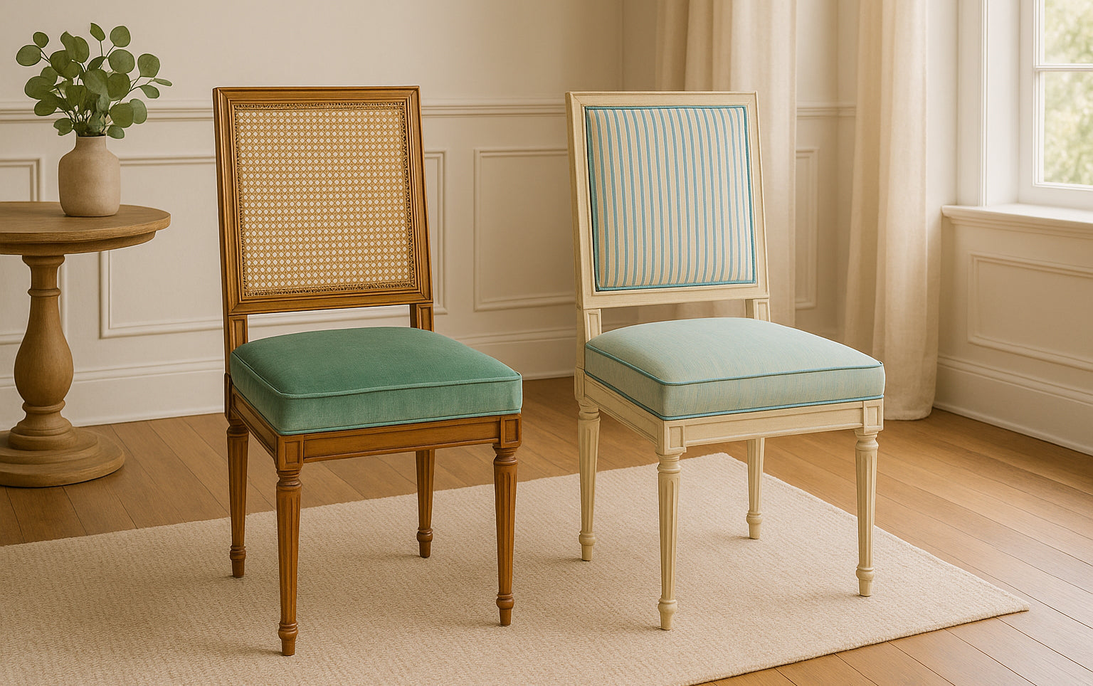 Deze stoelen vullen elkaar prachtig aan en zijn ideaal om te combineren rond een eettafel. Dankzij de hoogwaardige afwerking en klassieke vormgeving passen ze zowel in een landelijk als in een meer tijdloos interieur.