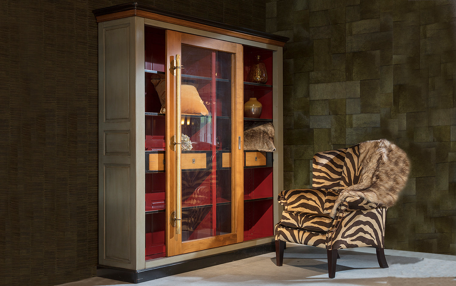 Vitrine Botanica. Een bijzonder fraaie vitrinekast. Twee grote glazen schuifdeuren en een lange verticale bronzen handgreep. De proporties versterken het originele karakter en maken het een uniek meubelstuk dat moeiteloos een “eyecatcher” wordt in uw interieur. Leverbaar in vele kleuren en kleurcombinaties.