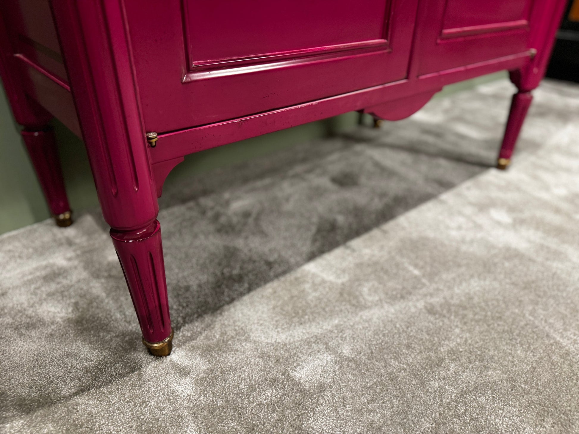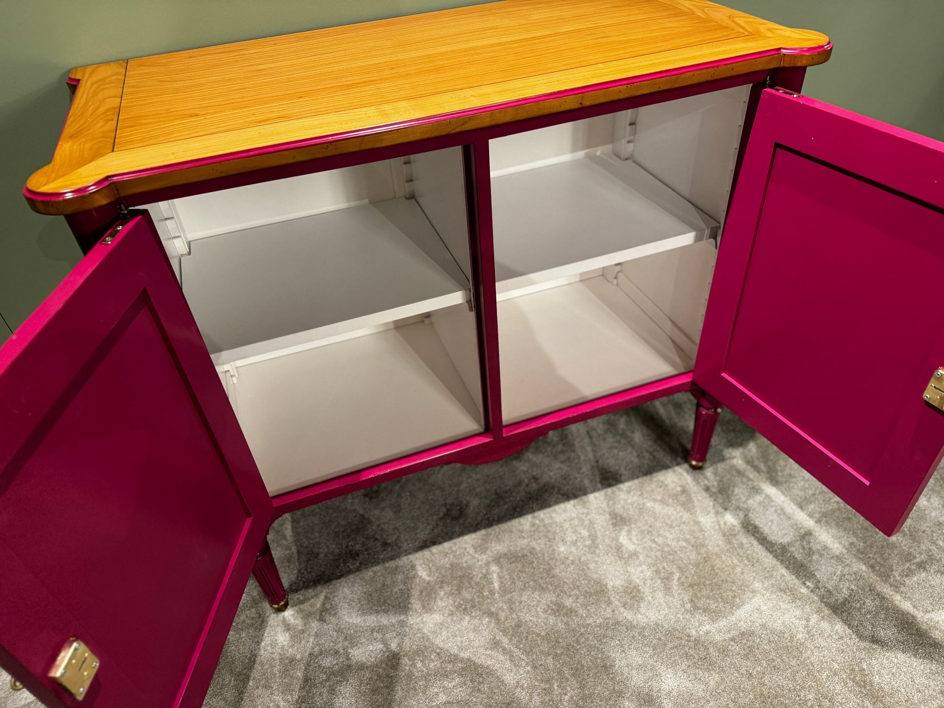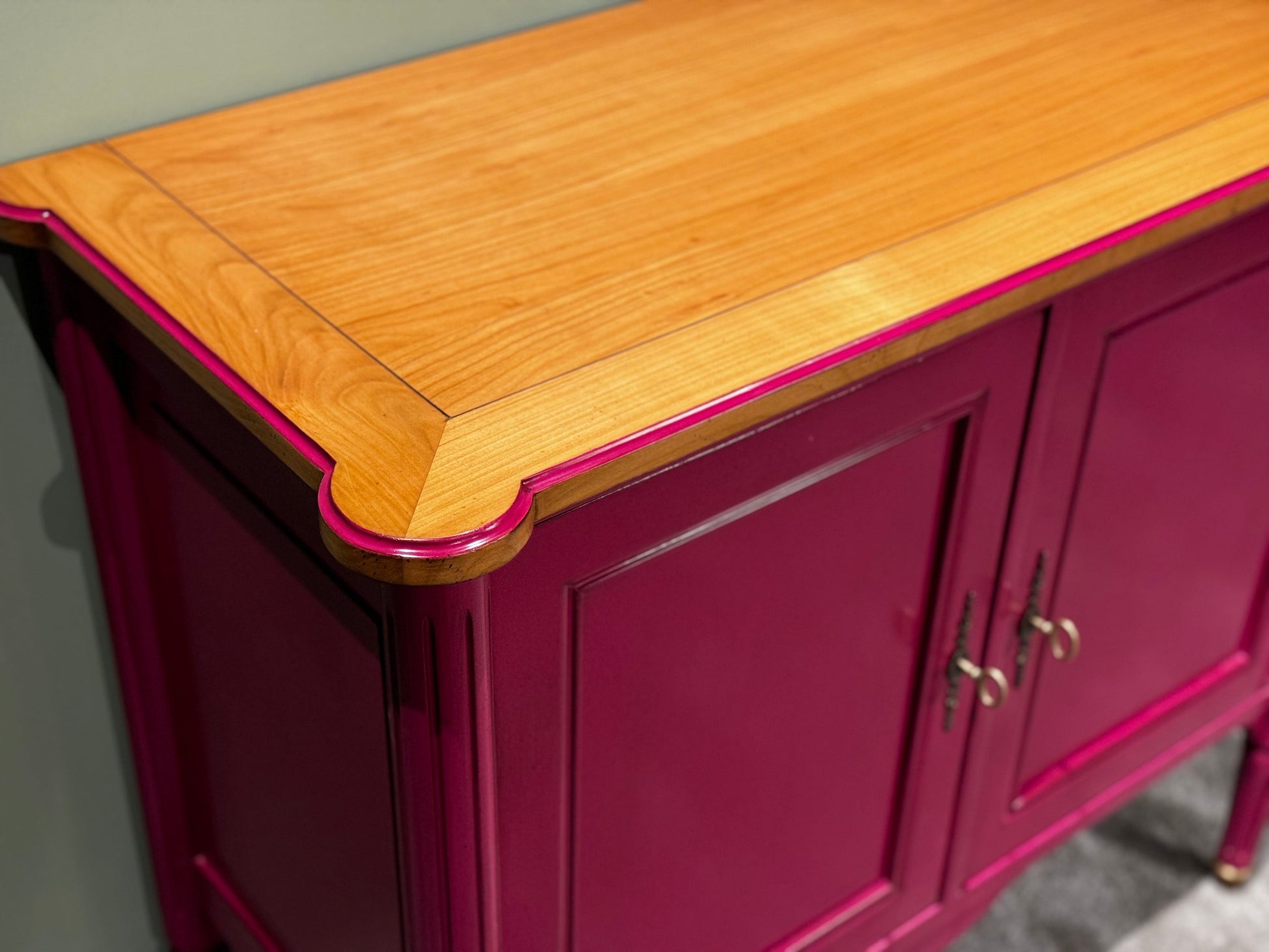 Het Ermitage kastje met zijn twee elegante deuren trekt onmiddellijk de aandacht met zijn gedurfde roze kleur, die subtiel contrasteert met het rijke kersen bovenblad. Deze unieke combinatie van kleuren en materialen creëert een verfijnde en eigentijdse uitstraling die elke ruimte verrijkt met een vleugje speelse elegantie.