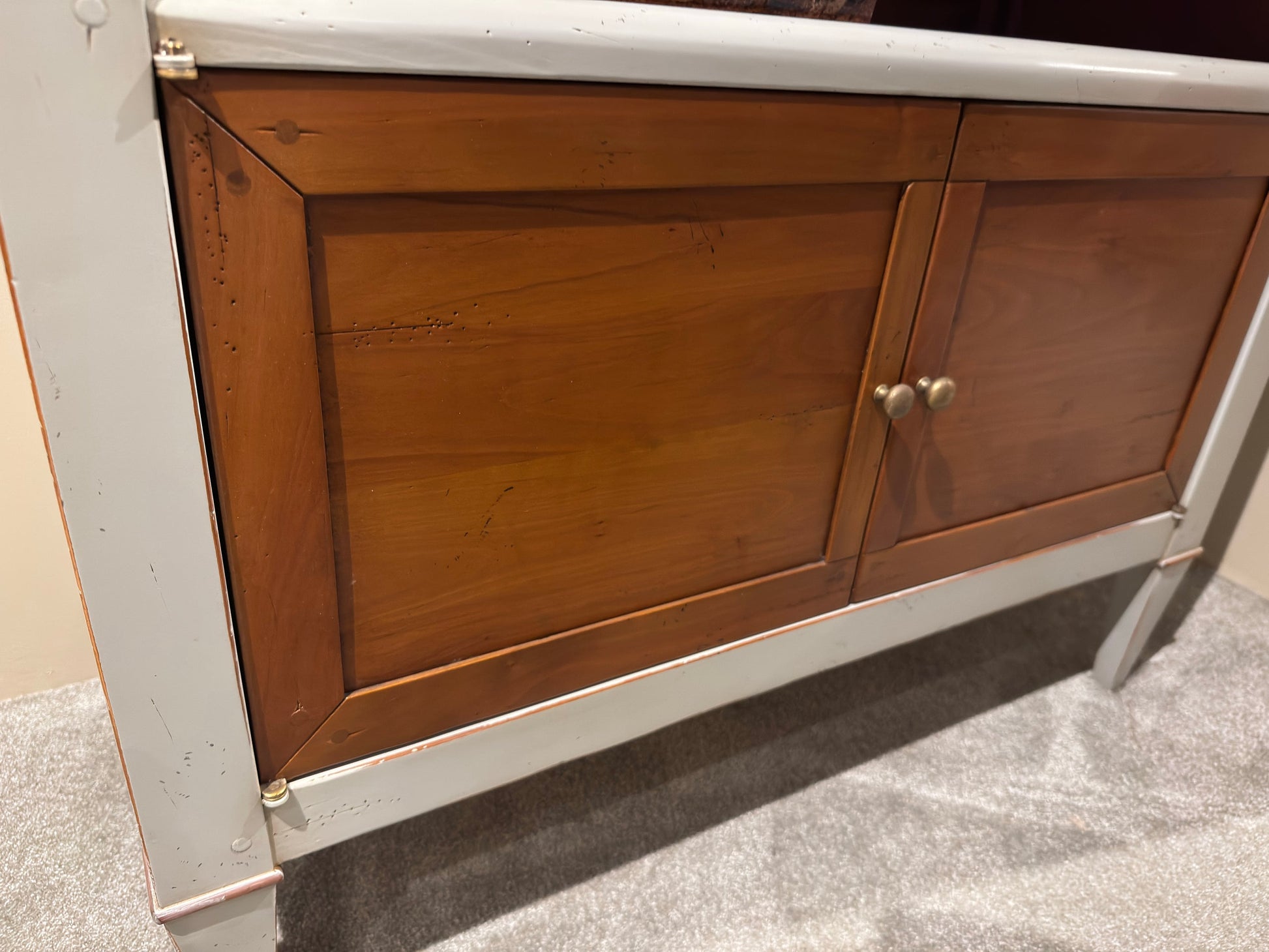 Dit elegante kastje combineert de charme van klassiek Frans design met een moderne uitstraling. Het meubel is uitgevoerd in een warme combinatie van naturel hout en subtiel grijs, waarbij de fijne details en het tijdloze karakter direct opvallen. De strakke lijnen en sierlijke afwerking maken het een blikvanger in ieder interieur.