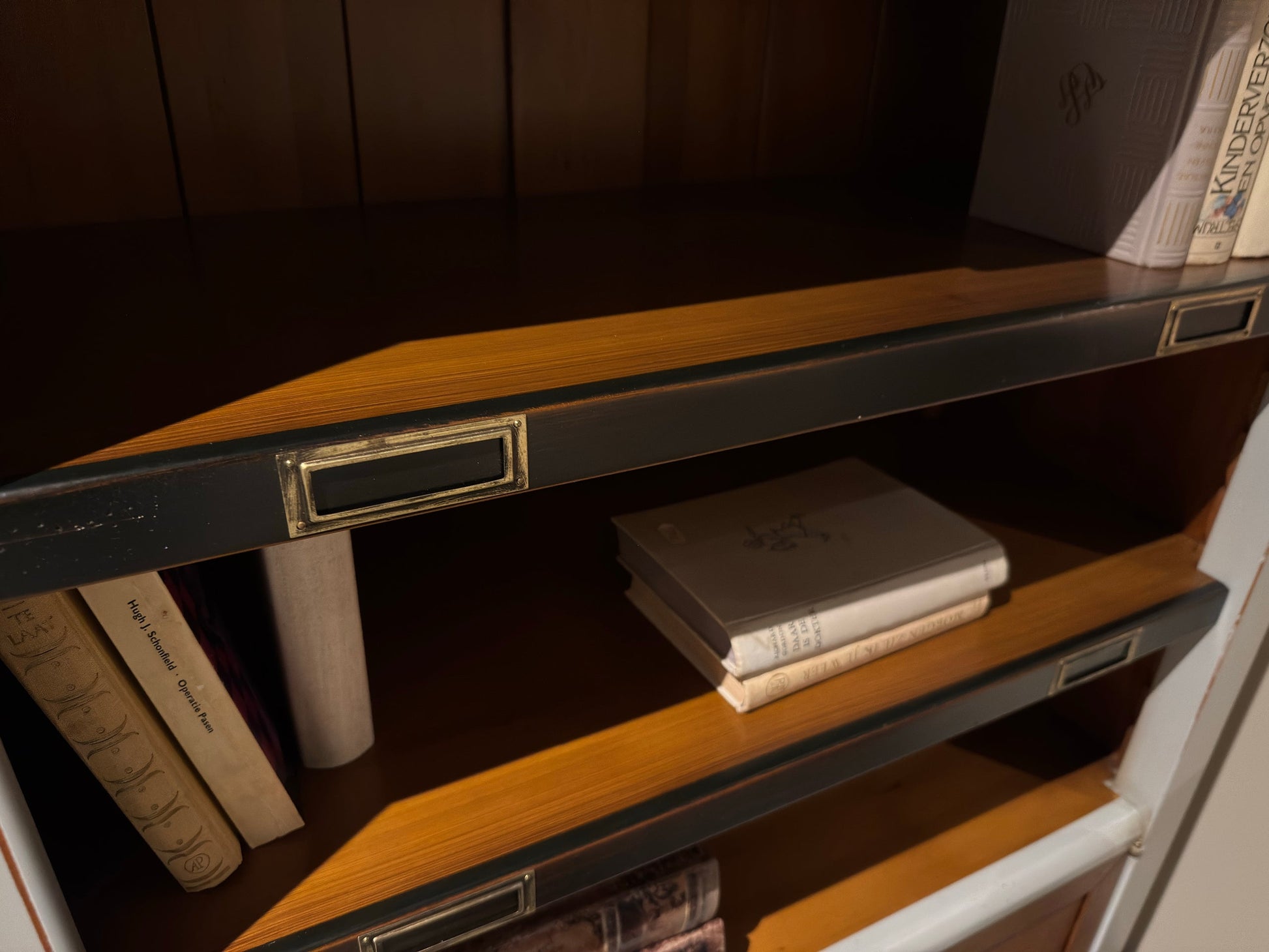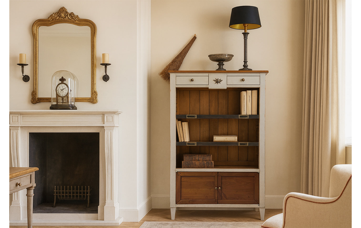 De open vakken bieden ruimte voor boeken of decoratieve objecten, terwijl de afsluitbare kastdeuren onderaan zorgen voor praktische opbergruimte. Afgewerkt met stijlvolle beslagknoppen en een verfijnd bovenblad straalt dit kastje pure klasse uit.