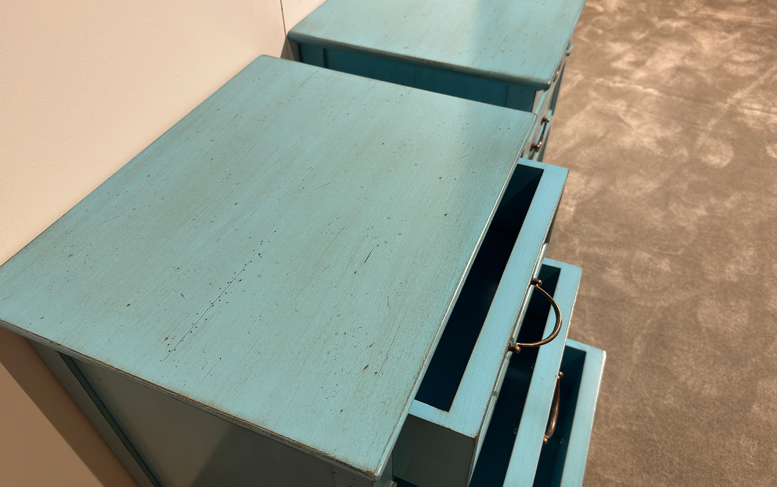 Ze zijn vervaardigd uit warm kersenhout met een zijdeglans afwerking die de natuurlijke nerf benadrukt. De kastjes rusten op rechte, taps toelopende poten met subtiele bronzen voetbeslag, typisch voor de sobere verfijning van de Directoire-periode.