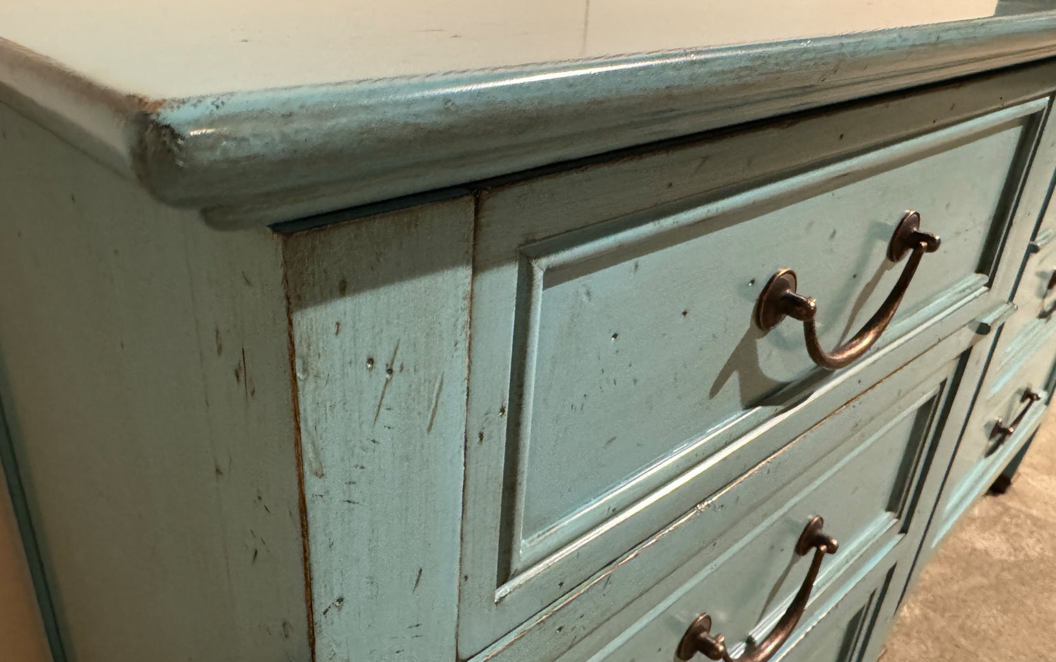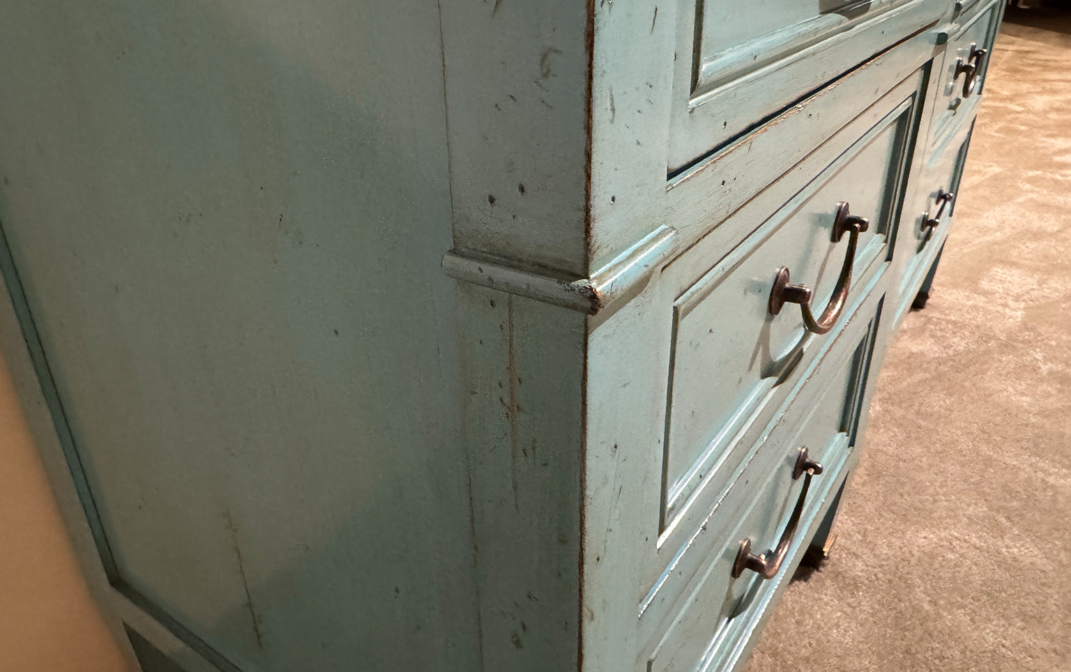 De messing of bronskleurige grepen hebben een sierlijke, doch eenvoudige vorm die perfect aansluit bij de rechte lijnen en strakke proporties van het ontwerp. De fronten van de laden zijn voorzien van een fijne profilering die diepte en karakter toevoegt zonder overdadige versiering.