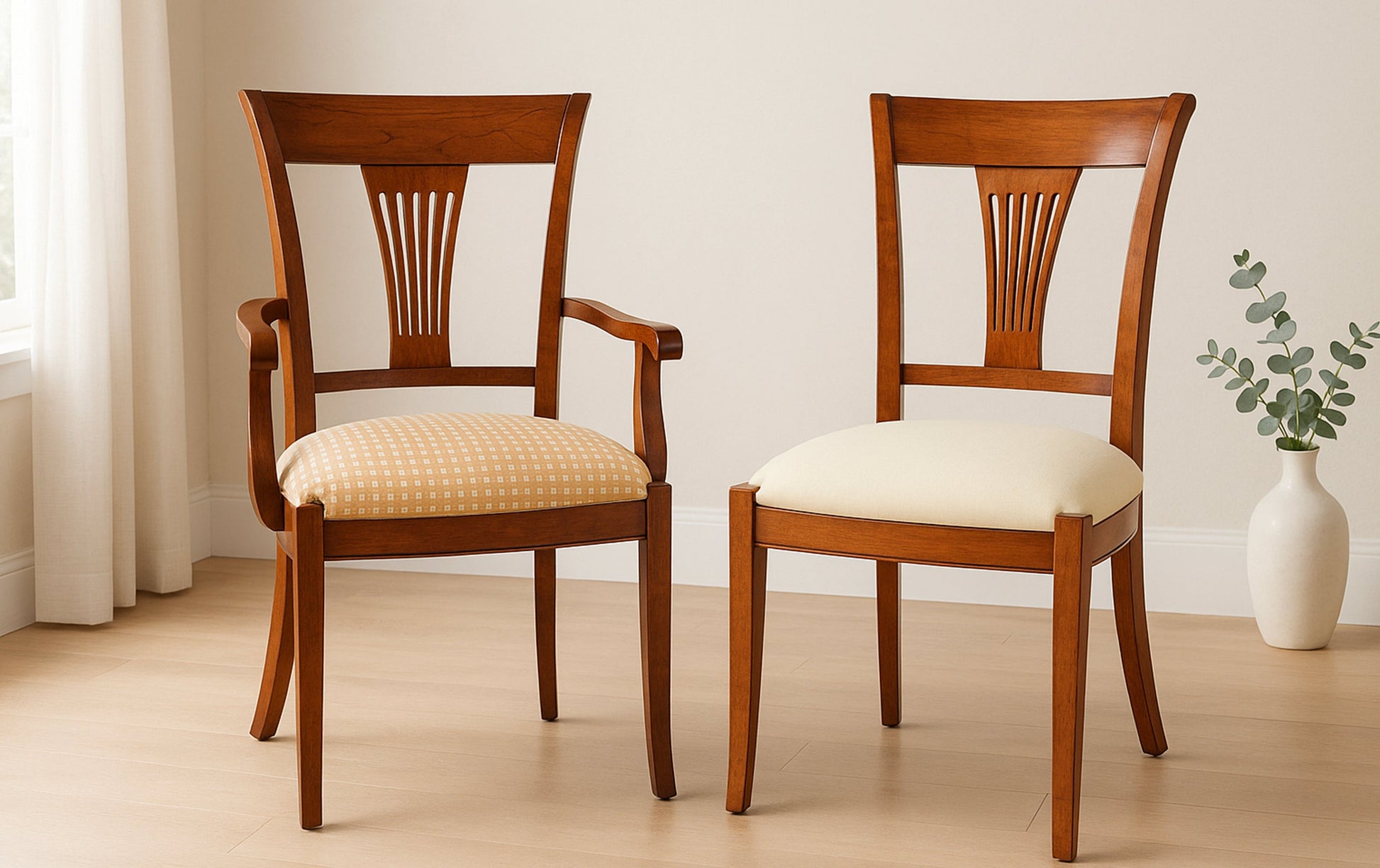 De Palmette stoelen hebben een elegante, klassieke uitstraling met een verfijnde Franse stijl. Ze zijn vervaardigd uit warm getint massief hout met een sierlijk gevormde rugleuning waarin een subtiel opengewerkt waaiermotief te zien is. De stoel met armleuningen biedt extra comfort, terwijl de armless variant een lichtere, luchtige indruk geeft. Beide hebben een comfortabele gestoffeerde zitting, ideaal voor een stijlvolle eetkamer of salon.