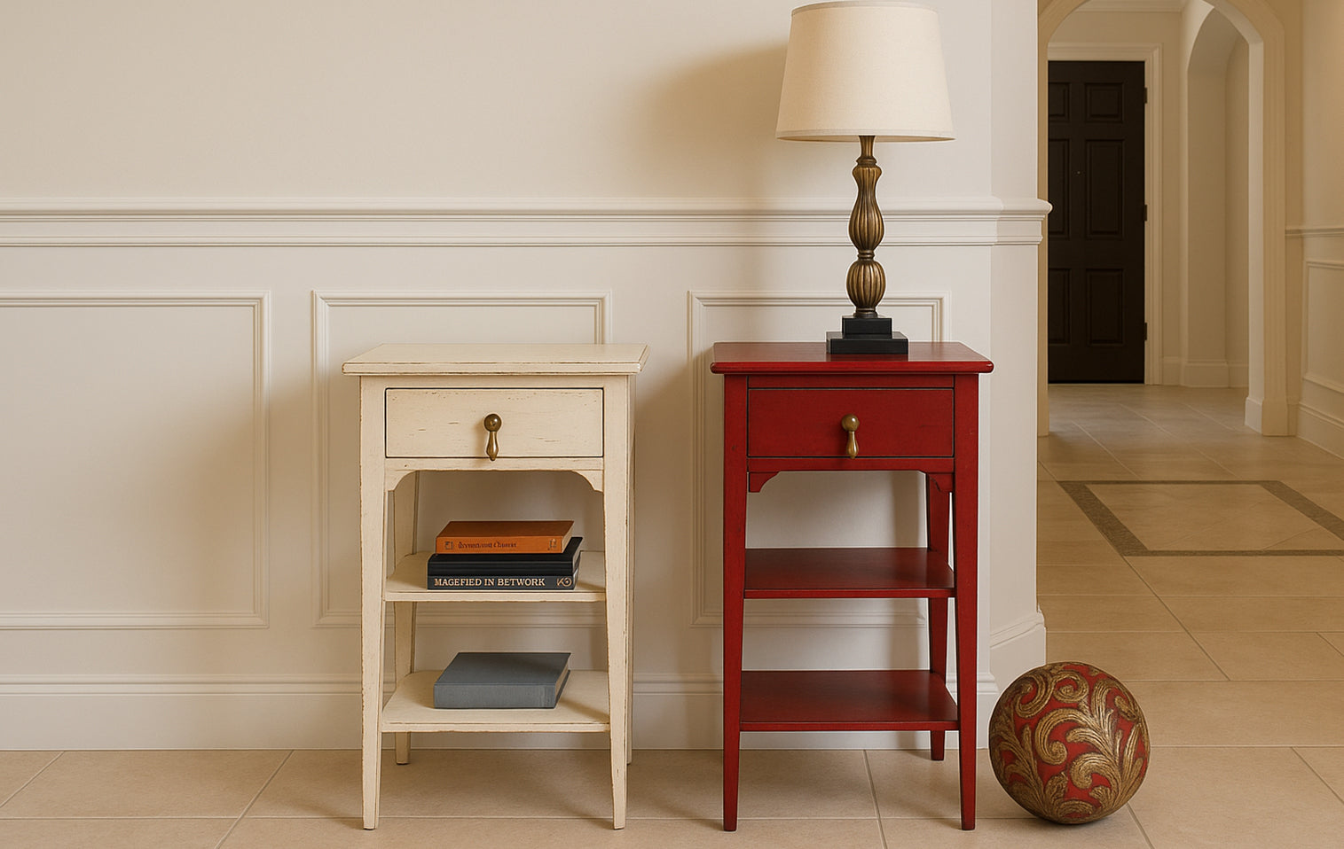 Wanneer je de hal binnenkomt, word je direct verwelkomd door het charmante tafeltje dat naast zijn evenbeeld staat. De warme kleur en de zachte, natuurlijke nerf van het hout geven de ruimte een uitnodigende gloed. Het ranke model met sierlijke lade en plank straalt rust en elegantie uit, alsof het speciaal gemaakt is om een welkom hoekje te creëren waar stijl en huiselijkheid elkaar ontmoeten.