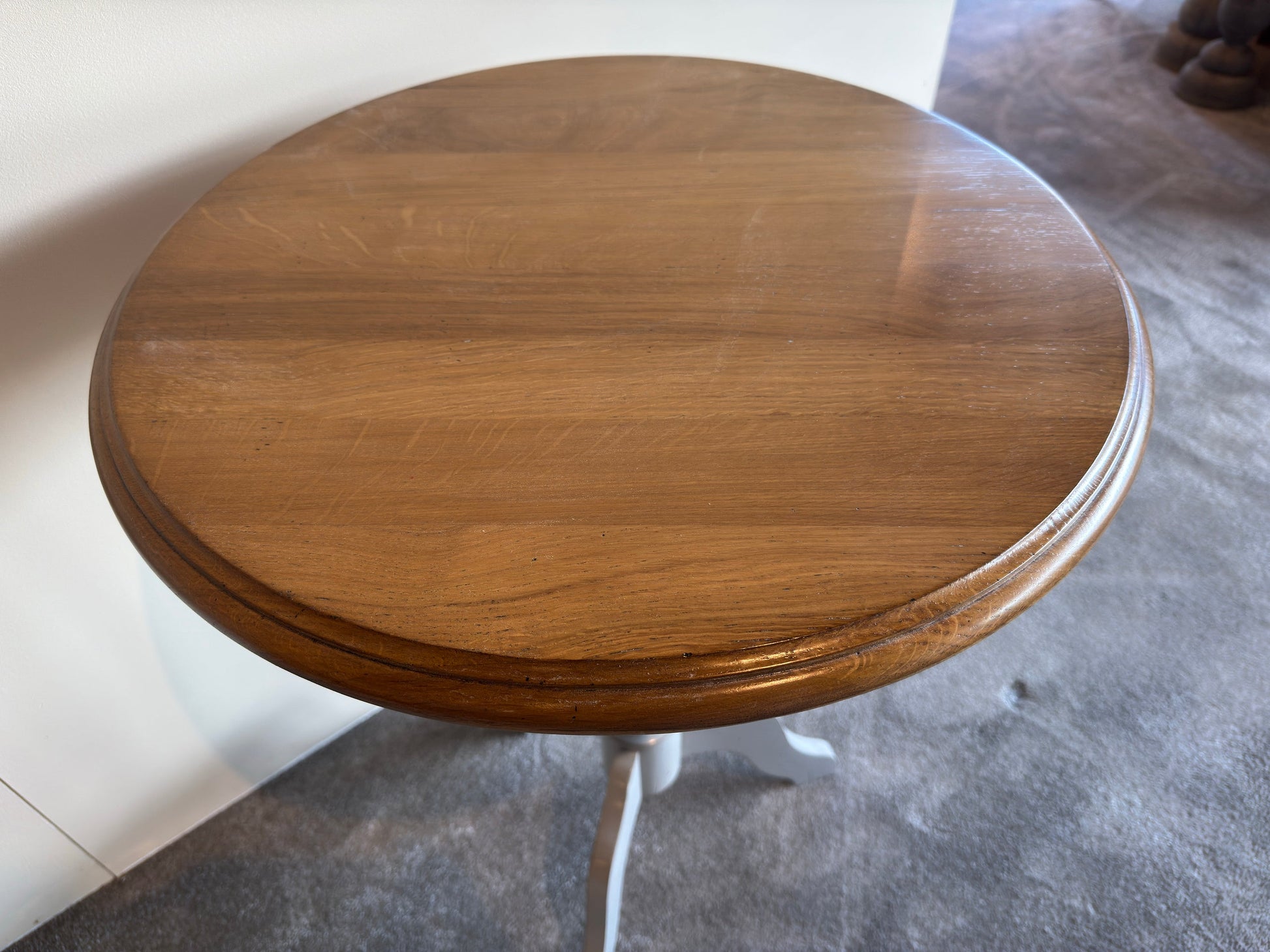 De bijzettafel Philippe is een stijlvol en tijdloos meubelstuk dat moeiteloos past in zowel klassieke als moderne interieurs. Het ronde tafelblad van warm hout vormt een elegant contrast met het slanke, verfijnde onderstel. Dankzij zijn compacte formaat is dit tafeltje ideaal naast een fauteuil of bank, maar ook perfect als sierlijke plek voor een vaas, lamp of koffiekopje.