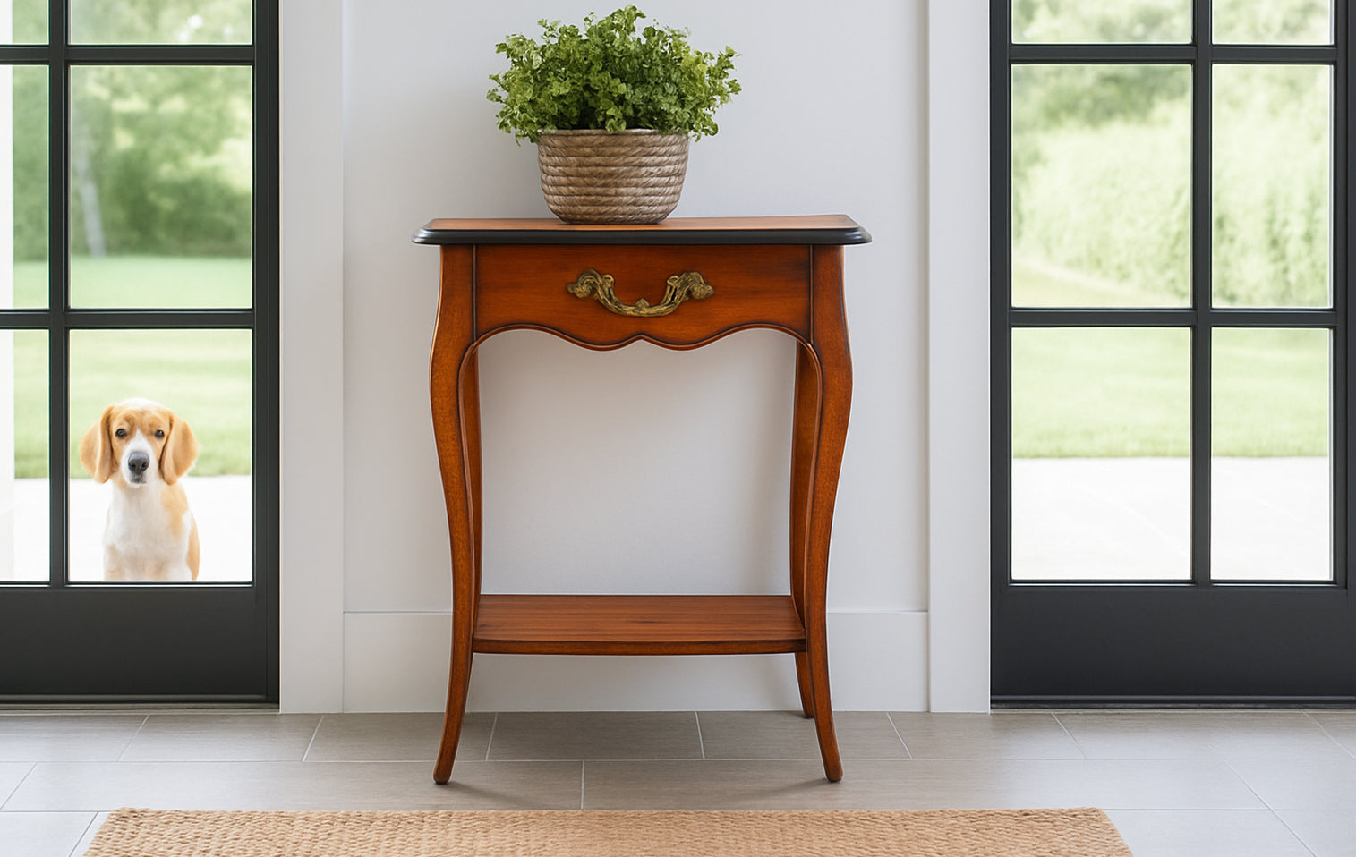 Dit charmante wandtafeltje is een prachtig voorbeeld van klassieke Franse elegantie. Met zijn slanke gebogen poten, verfijnde sierbeslag en warme houtkleur straalt het meubelstuk karakter en authenticiteit uit. Het compacte formaat (55 cm breed x 76 cm hoog) maakt dit tafeltje ideaal voor een hal, gang of sfeervolle hoek in de woonkamer. Perfect om een mooie vaas, plant of lamp op te plaatsen, terwijl de onderste plank extra ruimte biedt voor decoratie of praktische opbergmogelijkheden.